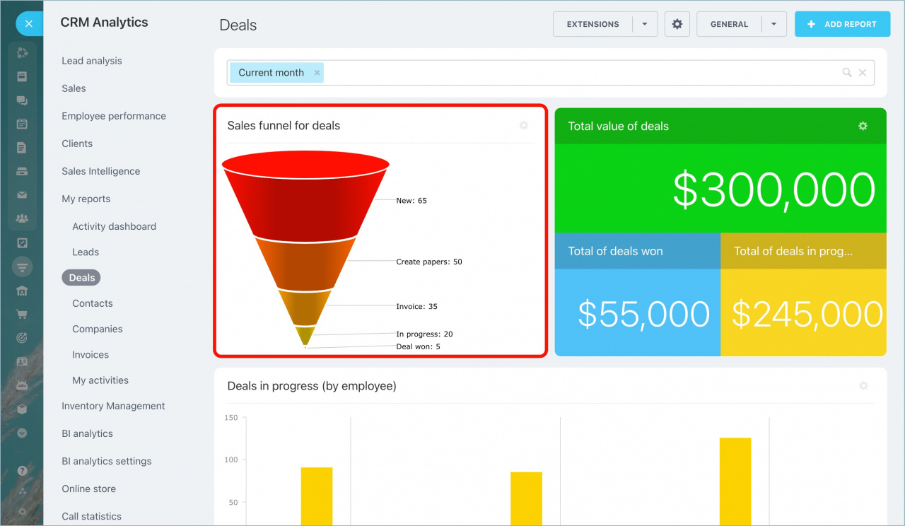 Quando os dados estão organizados no Bitrix24, o BI permite criar indicadores como: